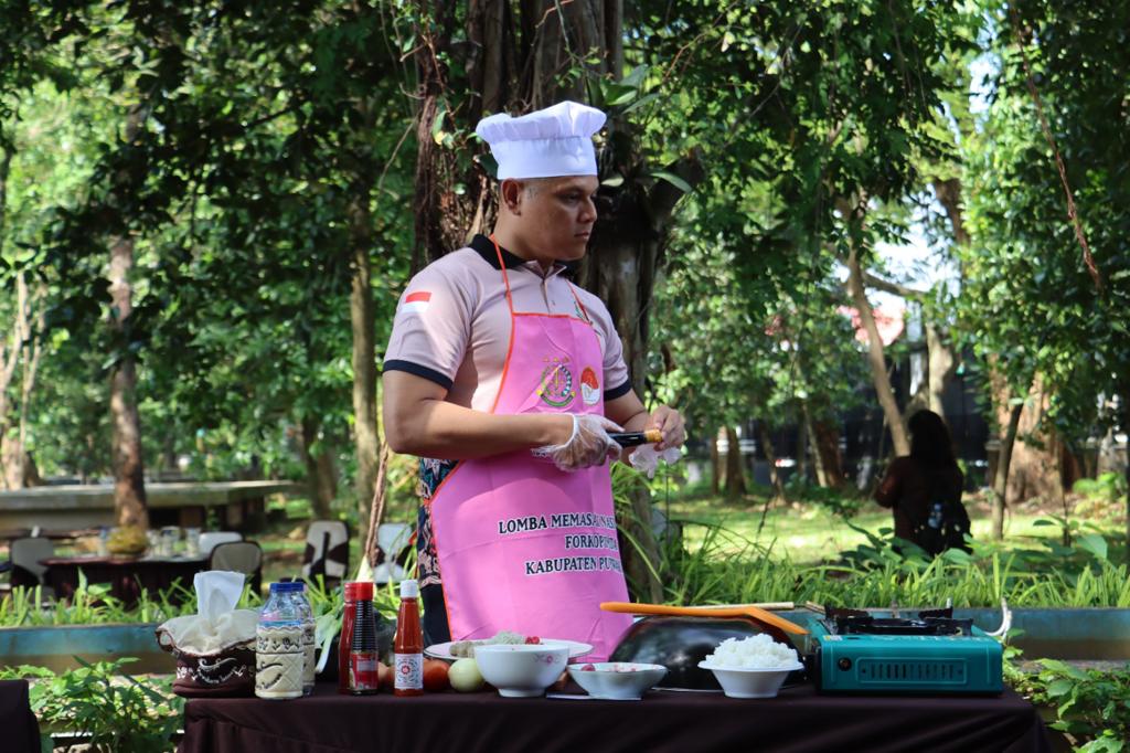 AKBP Edwar Zulkarnain tampil layaknya chef profesional saat meracik bumbu yang sudah disediakan panitia dalam kegiatan lomba memasak nasi goreng antar Forkopimda dan perangkat daerah Kabupaten Purwakarta.