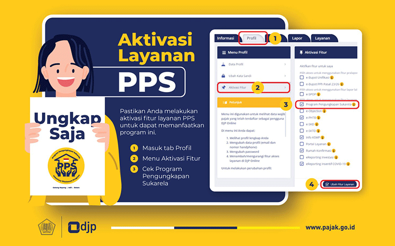 Melalui PPS, Wajib Pajak Orang Pribadi dapat melaporkan hartanya secara sukarela melalui aplikasi pengungkapan dan pembayaran https://pajak.go.id/pps 24 jam dalam tujuh hari sejak 1 Januari 2022. Masyarakat umum juga dapat memantau perkembangan PPS melalui portal tersebut.