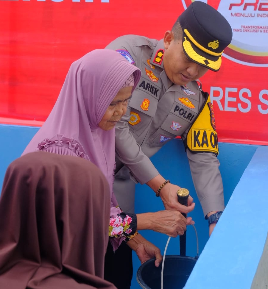 IDEANEWSID. Kapolres Subang AKBP Ariek Indra Sentanu didampingi Ketua Bhayangkari meresmikan sumur bor dan membagikan ratusan bantuan sosial (bansos) kepada warga di Kampung Pasirtanjung, Desa Sidajaya, Kecamatan Cipunagara, Kabupaten Subang, Selasa (25/6/2024)