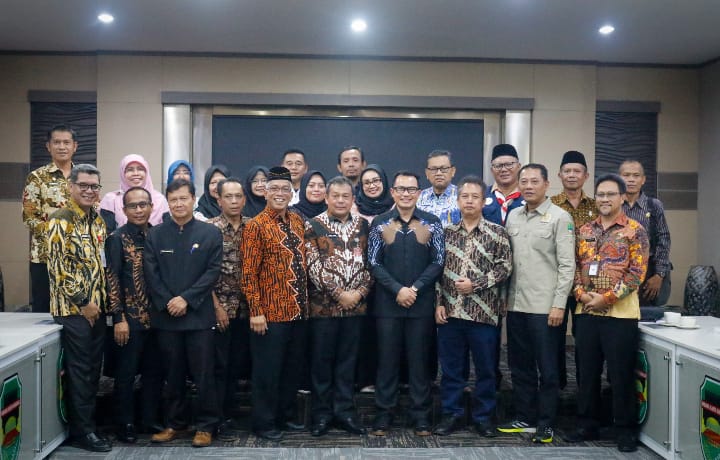 FOTO BERSAMA. Komisi V DPRD Provinsi Jawa Barat berfoto bersama Pj Bupati Purwakarta beserta jajaran usai pembahasan lahan hibah untuk pembangunan SMAN Pondoksalam.