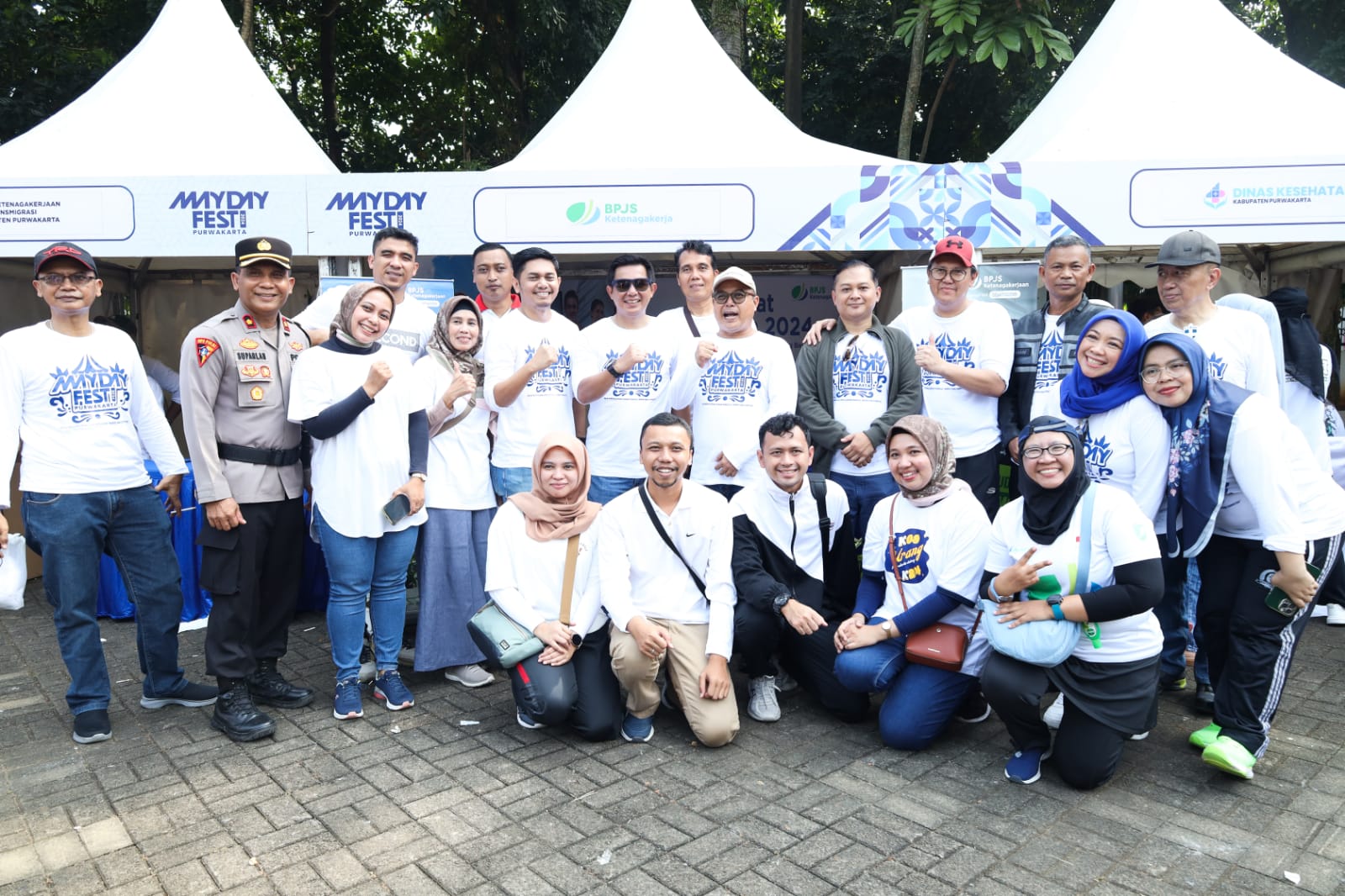 FOTO BERSAMA. Pimpinan dan karyawan BPJamsostek Cabang Purwakarta berfoto bersama di depan stand BPJamsostek pada acara May Day Fest 2024 yang digelar di alun-alun Purwakarta.